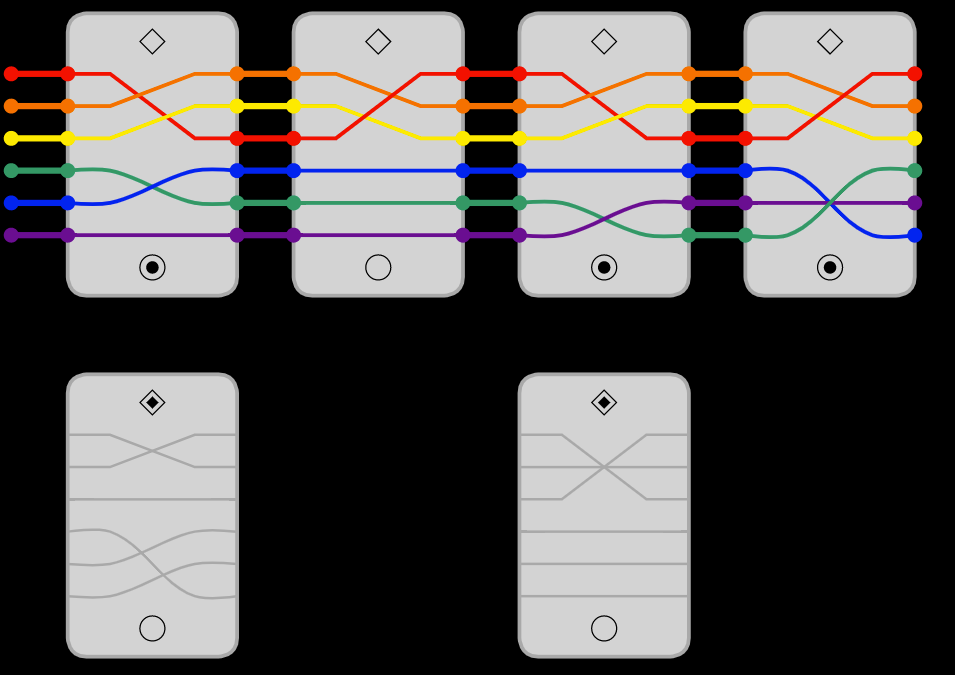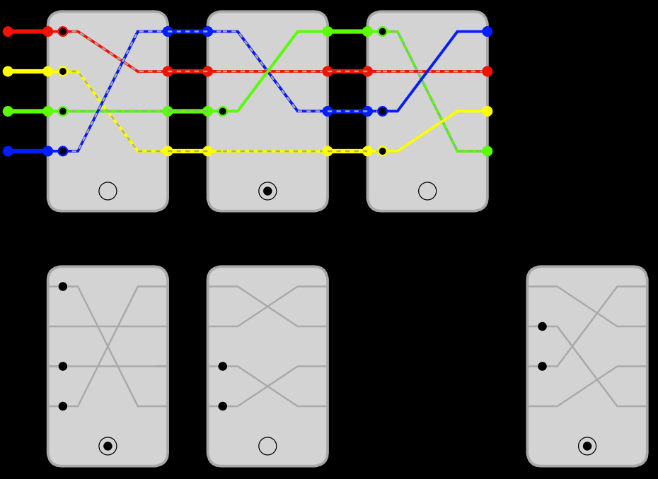 The wreath product is a way to construct a new group from old groups together with a certain type of group action. In this example we consider the cyclic group of order 2 Z2 acting independently on each element of the set of n elements. The action on an element is represented by a dot on the card, and when the line passes through the dotted, it becomes a dashed line (or if it is already dashed it becomes solid). The goal is the same as the the variants above, compose to the identity element, but the Z2 action must be trivial as well! In the language of the game, not only must the colors end up correctly arranged, but all of the lines must end up solid rather than dashed.